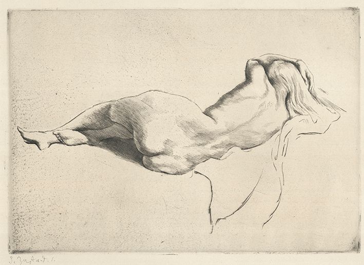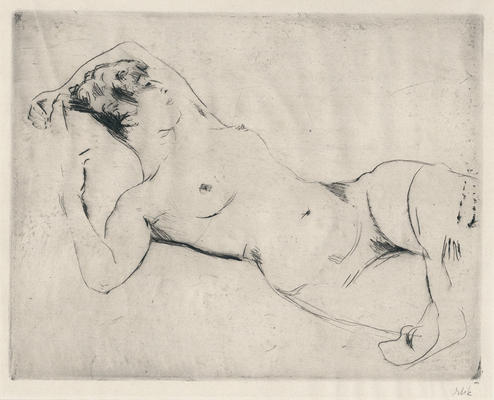 Liegender weiblicher Akt mit erhobenen Armen