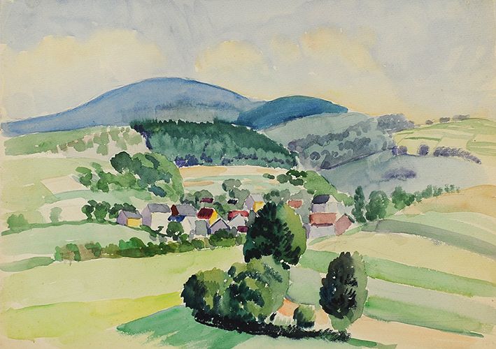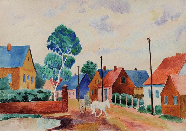 Thüringer Dorf mit Pferdegespann (Aquarell zum Ölgemälde)