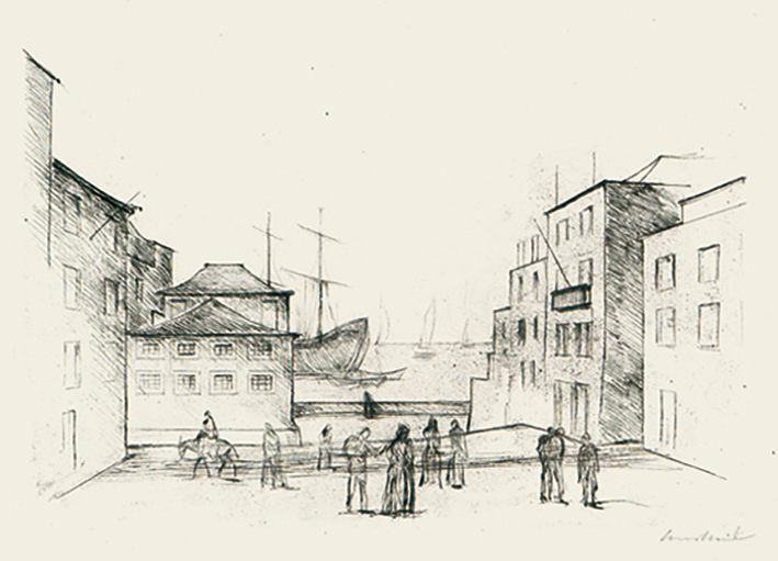 Männer, Häuser, Laterne und Schiebkarren (auch: Straßenmusikanten)