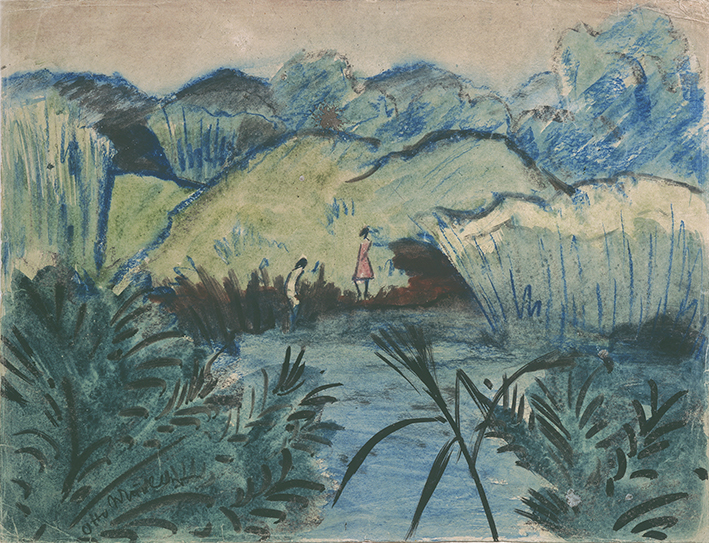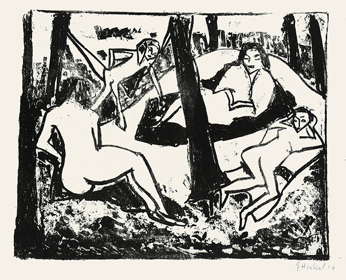 Teichlandschaft/Badende am schwarzen Wasser/Zwei Badende/Mädchen im Schilf