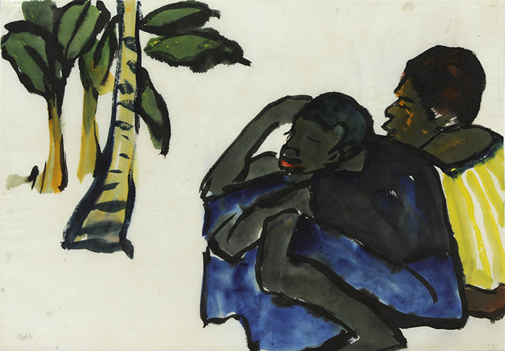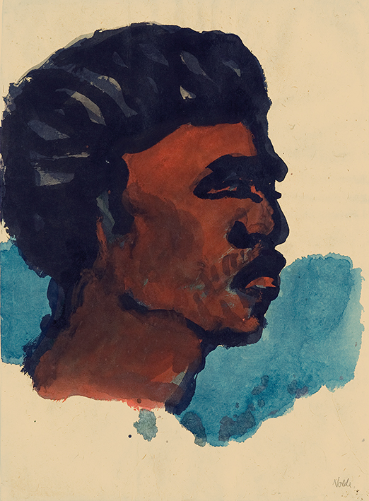 Bildnis eines Südsee-Insulaners im Profil nach rechts (rotbraun, blauer Grund)
